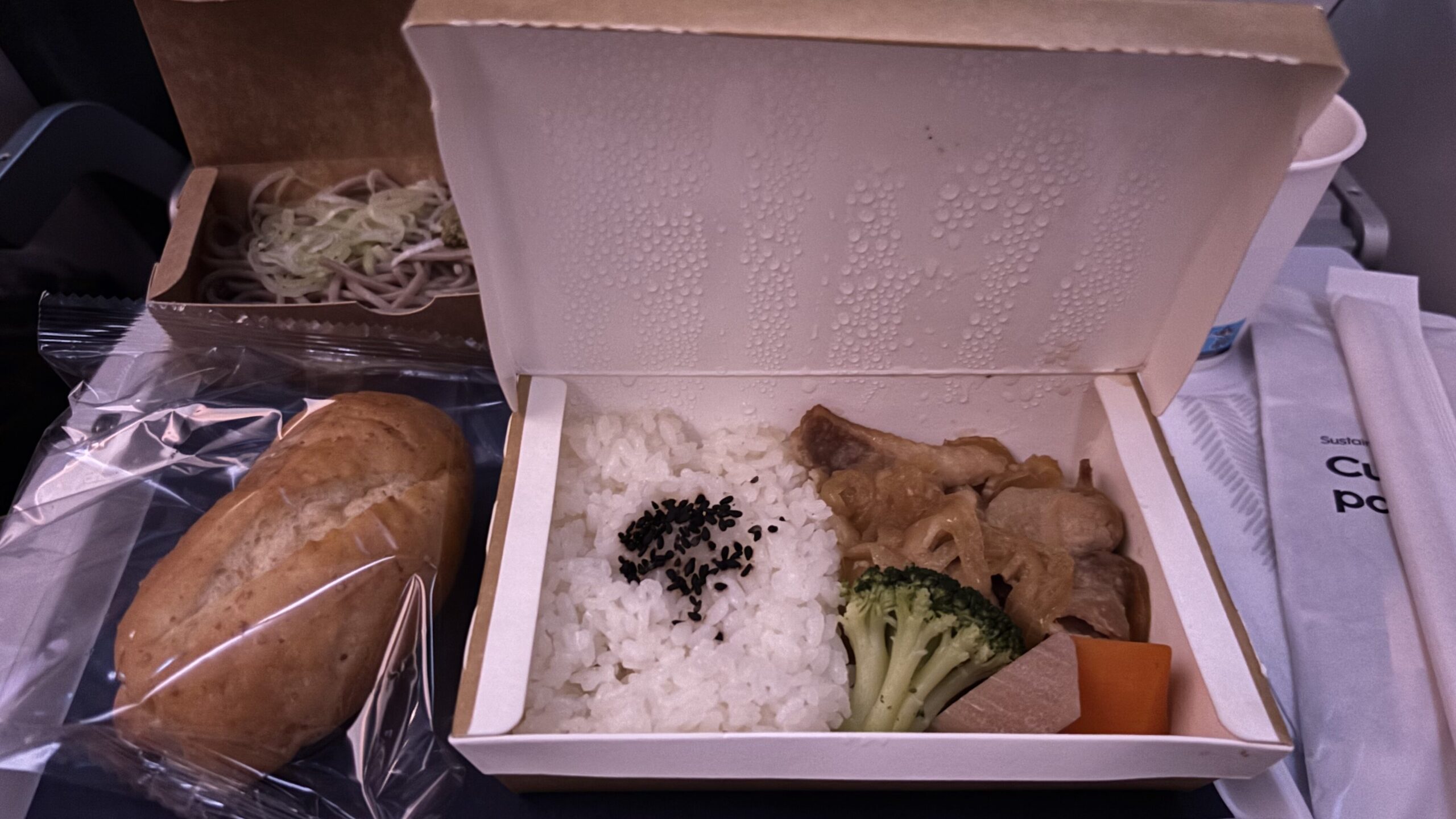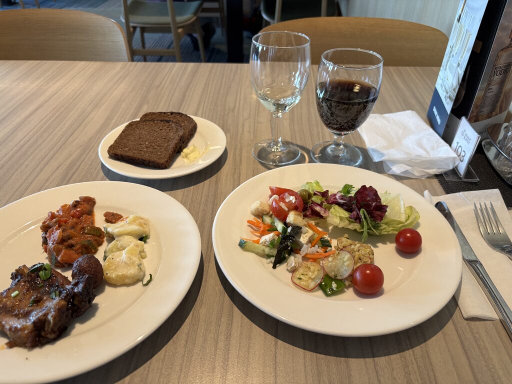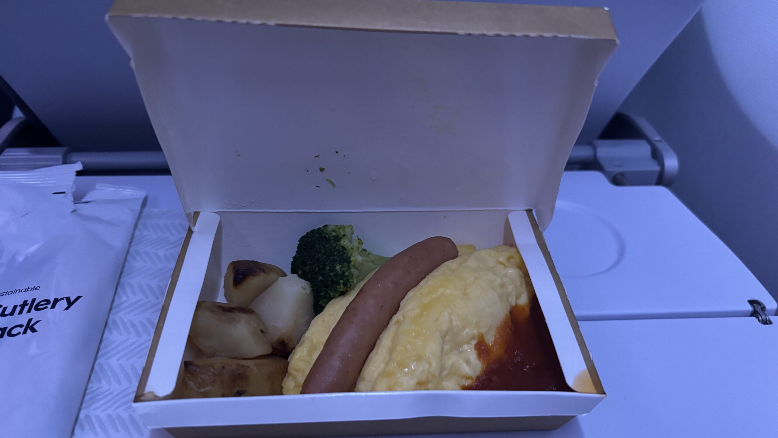 離陸してすぐ、そして到着の2時間ほど前に機内食が提供されました。夕食は2種類、朝食はオムレツの1種類のみでした。