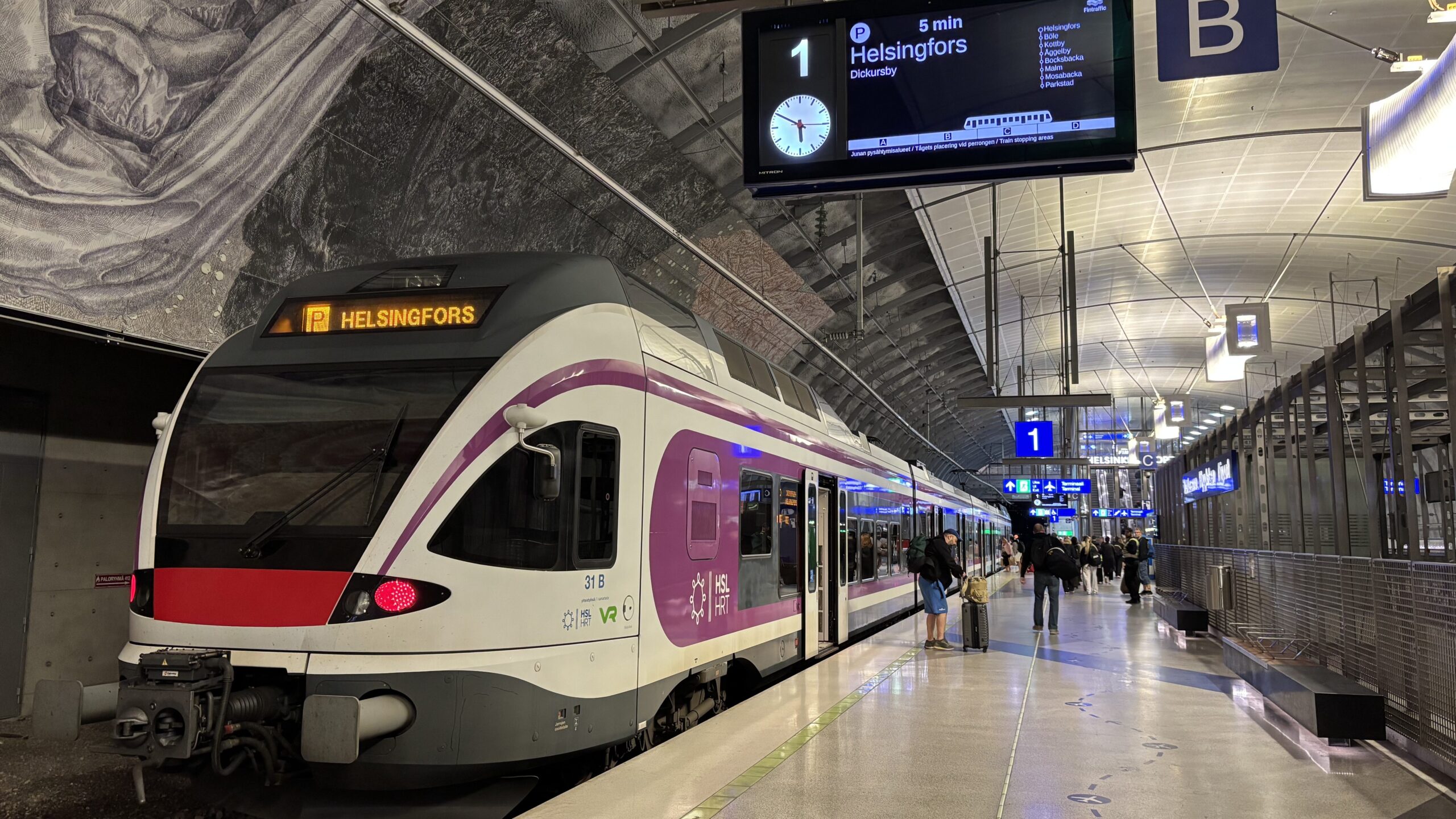 約30分でヘルシンキ中央駅に到着。フィンランド北部へ向かう路線もこの駅から発着しています。