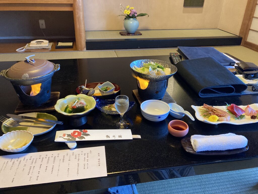 こちらのホテルも食事は伊豆の海鮮を使った懐石料理が中心。部屋食ではないですが、食事会場は半個室になっており、一人でもゆっくりと食事を楽しめるのは良いポイントですね。