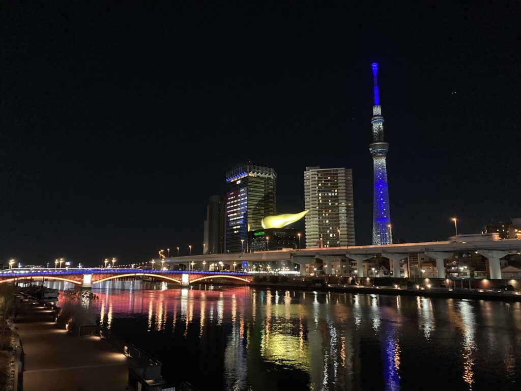 ここからはライトアップされた東京スカイツリーを間近に見ることができます。また、隅田川にかかる橋もライトアップされているので、橋とスカイツリーの共演を楽しめるのも隅田公園ならではの特徴です。