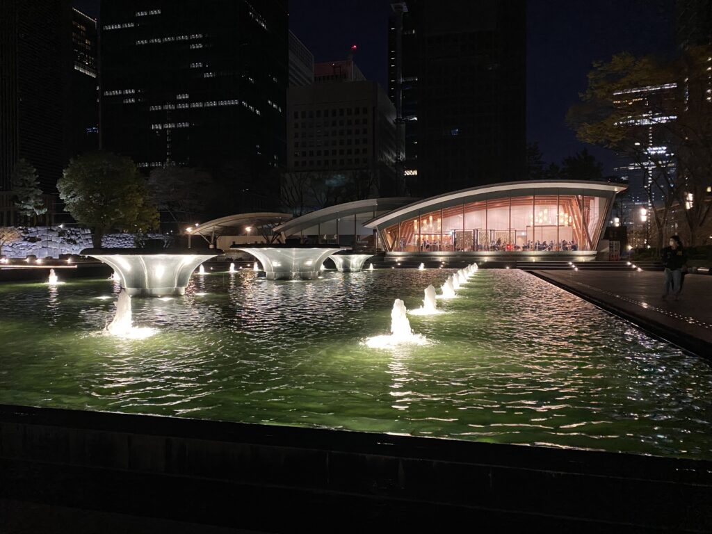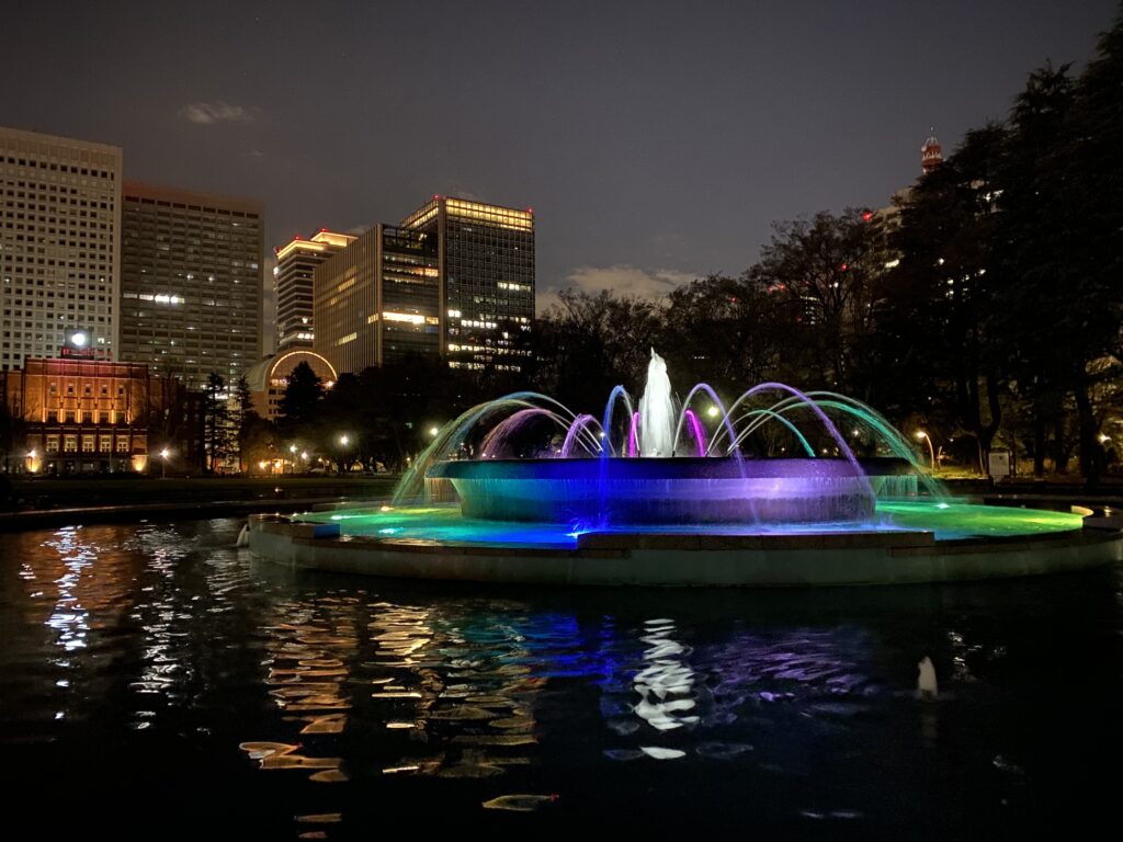 ここは東京の中心部にありますが、夜になると静かで落ち着いた公園になります。ライトアップされた噴水も見どころの一つです。ベンチに座りながらゆっくりすることができるスポットです。