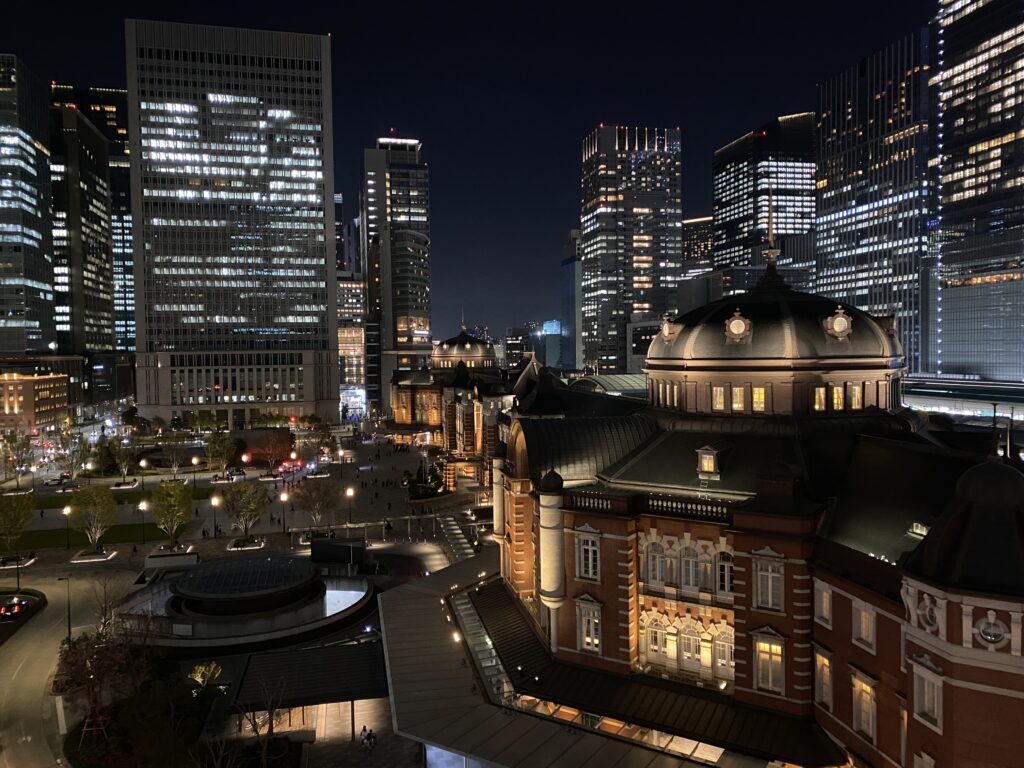 ここからは東京駅と周辺のビル群、そして全国各地へと出発していく列車たちが織りなす夜景を楽しむことができます。
