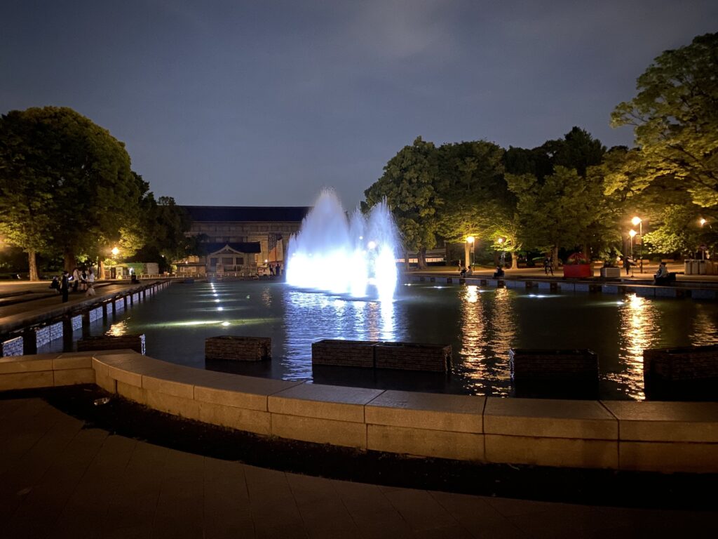 ゆっくり過ごしやすい場所は、東京国立博物館前に広がる噴水のエリア。ここではライトアップされた噴水ショーを楽しむことができます。ベンチも多く、夜になると周りも落ち着いた雰囲氣になるので、一人でもゆっくり過ごせます。