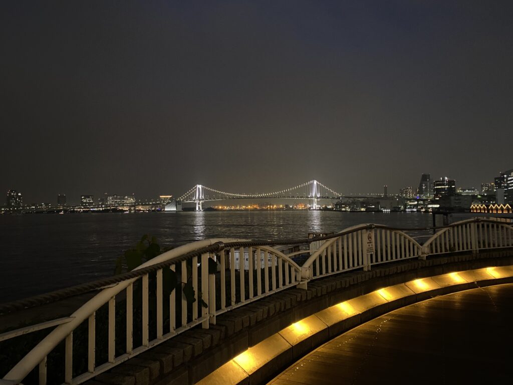 豊洲ぐるり公園」は豊洲の海側に広がる公園です。公園からはレインボーブリッジをはじめとしたお台場エリアの夜景を見ることができます。