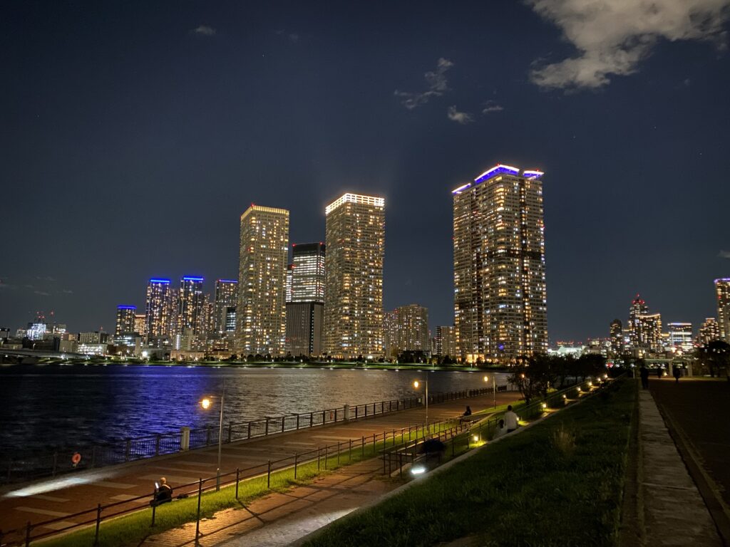 ここからは晴海エリアの高層マンションをはじめとした夜景を楽しむことができます。建物が近いので、豊洲ぐるり公園とは違った迫力ある夜景です。