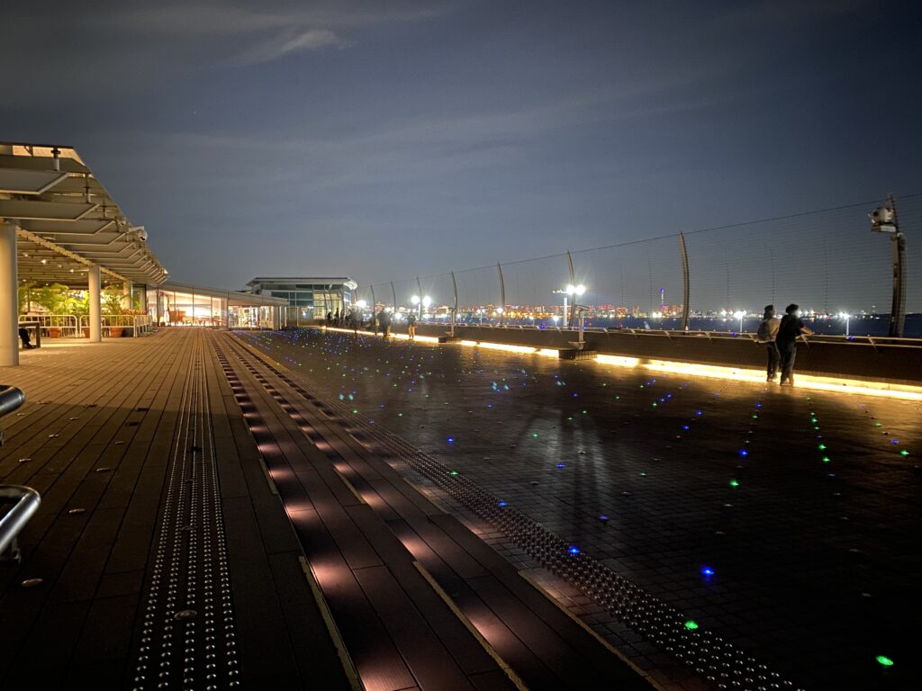 羽田空港第2ターミナルの展望デッキは、夜になるとライトアップされます。間接照明を使ったロマンチックな空間が広がっています。